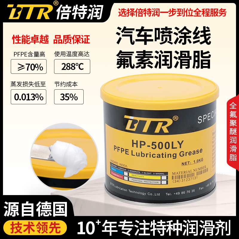 倍特润BTR HP-500LY汽车喷涂线氟素润滑脂不会燃烧,高温无分解,无积碳,而且化学惰性强、不与强酸、强碱等反应,因而此产品具有耐高温、抗磨、耐腐蚀、使用寿命长等特点,推荐应用于有高温、接触化学介质、要求长寿命的工况。适用温度范围:-50℃~+288℃,最高间歇耐温300℃。